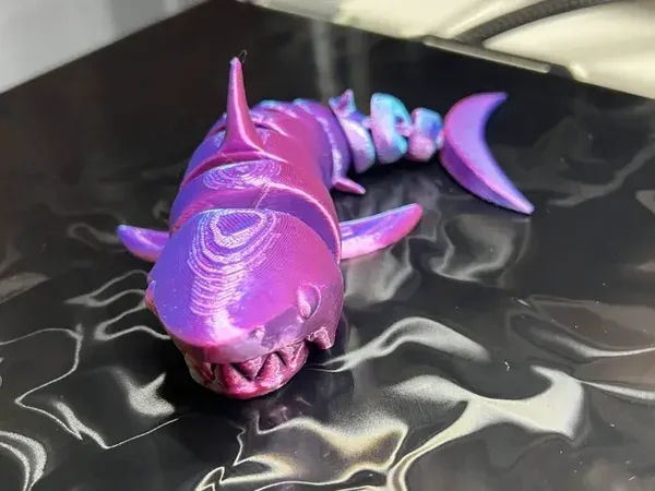 Dieser außergewöhnliche 3D-gedruckte Flexi-Hai begeistert mit seiner faszinierenden Farbgebung und seiner beweglichen Struktur. Gefertigt aus hochwertigem, schimmerndem Filament in lebendigen Lila-, Blau- und Pinktönen, zieht er sofort alle Blicke auf sich.